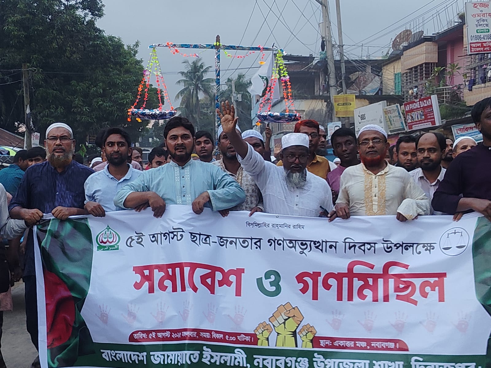 এম সাজেদুল ইসলাম সাগর , নবাবগঞ্জ (দিনাজপুর) প্রতিনিধি:- ৫ আগস্ট ঐতিহাসিক জুলাই মাসের গণঅভ্যুত্থানের বর্ষপূর্তি উপলক্ষে দিনাজপুরের নবাবগঞ্জে বিজয় মিছিল ও আলোচনা সভার আয়োজন করেছেন বাংলাদেশ জামায়াতে ইসলামী নবাবগঞ্জ উপজেলা শাখা। ২০২৪ সালের ৫ আগস্ট, ইতিহাসে দিনটি ‘জুলাই গণঅভ্যুত্থান দিবস’ হিসেবে স্বীকৃতি পেল। দীর্ঘ একমাসের রক্তাক্ত ছাত্র আন্দোলনের পর এদিনে দেশজুড়ে অভ্যুত্থান ঘটে, পতন ঘটে শেখ হাসিনার নেতৃত্বাধীন সাড়ে ১৫ বছরের ফ্যাসিবাদী শাসনের। জনগণের ঐক্য, আত্মত্যাগ ও ছাত্রদের দৃঢ় মনোভাবের কাছে মাথানত করে শেখ হাসিনা দেশত্যাগে বাধ্য হন এবং ভারতে পালিয়ে যান। বিকেল ৫ টায় উপজেলা জামায়াত ইসলামীর কার্যালয় থেকে একটি বিজয় মিছিল বের হয়। মিছিলটি উপজেলার প্রধান প্রধান সড়ক প্রদক্ষিণ করে । বিজয় মিছিলে জামায়াতে ইসলামীর কেন্দ্রীয় কমিটির সূরা সদস্য ও দিনাজপুর ৬ আসনের মনোনীত এম,পি প্রার্থী আনারুল ইসলাম , উপজেলা জামায়াতে ইসলামীর আমীর নজরুল ইসলাম, সেক্রেটারি রেজাউল ইসলাম সহ দলের ৯টি ইউনিয়নের প্রায় ২৫শত নেতাকর্মীরা অংশ নেন। বিজয় মিছিল শেষে ডাকবাংলা মোড় ৭১ মঞ্চে আলোচনা সভা অনুষ্ঠিত হয়। এতে বক্তারা বলেন,ছাত্র-জনতার প্রতিরোধের শুরু হয়েছিল কোটা সংস্কারের দাবিতে। জুলাই মাসে ঢাকা বিশ্ববিদ্যালয় থেকে শুরু হওয়া এ আন্দোলন অল্পদিনেই ছড়িয়ে পড়ে দেশের সব বিশ্ববিদ্যালয় ও কলেজে। সরকারের একগুঁয়েমি ও বলপ্রয়োগ আন্দোলন দমাতে ব্যর্থ হয়ে আরও ক্ষুব্ধ করে ছাত্রসমাজকে। ১৬ জুলাই রংপুরে আবু সাঈদসহ কয়েকজন শিক্ষার্থী নিহত হলে আন্দোলনে রক্তের ধারা নামে। এরপর থেকে আইনশৃঙ্খলা বাহিনী ও আওয়ামী লীগ সমর্থকদের হামলায় প্রাণ হারান শতাধিক সাধারণ নাগরিক। শিশু, নারী, বৃদ্ধ কেউই রেহাই পাননি। আন্দোলন আর কোটা সংস্কারের দাবি ছাড়িয়ে পরিণত হয় সরকার পতনের ডাক হিসেবে। জাতিসংঘের মানবাধিকার বিষয়ক হাইকমিশনারের প্রতিবেদন অনুসারে, জুলাই-আগস্টের সহিংসতায় প্রাণ হারিয়েছেন অন্তত ১,৪০০ জন, যাদের মধ্যে ১১৮ জন শিশু। আহত প্রায় ১২ হাজার। বিশ্বের কাছে বাংলাদেশের শাসনব্যবস্থার নির্মম চেহারা স্পষ্ট হয় এই প্রতিবেদনের মাধ্যমে। জুলাইয়ের গণঅভ্যুত্থানের ঐতিহাসিক প্রেক্ষাপট ও তাৎপর্য তুলে ধরেন। একই সাথে গণতন্ত্র পুনঃপ্রতিষ্ঠা ও জনগণের অধিকার আদায়ের লক্ষ্যে ঐক্যবদ্ধ থাকার আহ্বান জানান।
