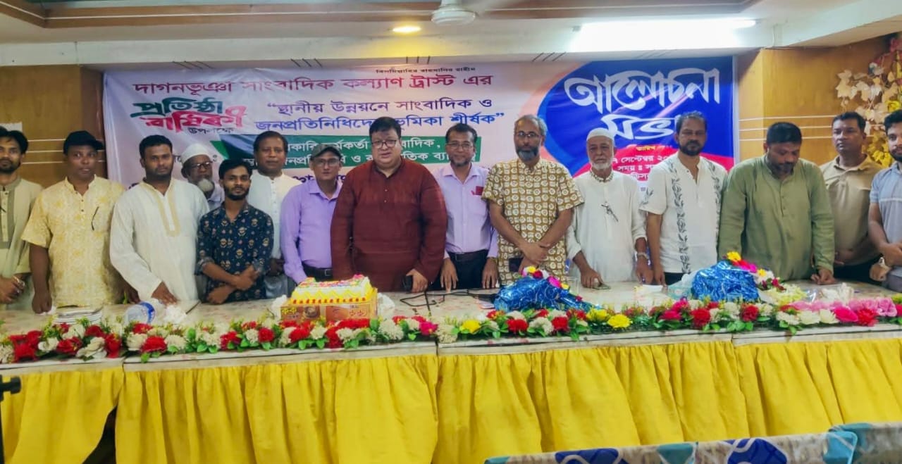 আবুল হাসনাত তুহিন ফেনী প্রতিনিধি:-দাগনভূঞা সাংবাদিক কল্যাণ ট্রাস্টের প্রতিষ্ঠাবার্ষিকী উপলক্ষে "স্থানীয় উন্নয়নে সাংবাদিক ও জনপ্রতিনিধিদের ভূমিকা" শীর্ষক আলোচনা সভা দাগনভূঞার একটি চাইনিজ কনভেনশন হলে অনুষ্ঠিত হয়েছে। ট্রাস্ট চেয়ারম্যান এম এ তাহের পন্ডিতের সভাপতিত্বে আয়োজিত এ সভায় প্রধান অতিথি হিসেবে উপস্থিত ছিলেন ফেনী জেলার স্থানীয় সরকার উপপরিচালক (উপসচিব) গোলাম মো: বাতেন। ট্রাস্টের সাধারণ সম্পাদক( ভারপ্রাপ্ত) আবুল হাসনাত তুহিন ও সদস্য কামরুল ইসলাম টিটুর যৌথ সঞ্চালনা বিশেষ অতিথি হিসেবে বক্তব্য রাখেন, ফেনী জেলা জামায়াতে ইসলামীর নায়েবে আমির ও কেন্দ্রীয় মজলিসে শূরার সদস্য অধ্যাপক আবু ইউসুফ, দৈনিক ফেনীর সময় সম্পাদক ও রিপোর্টার্স ইউনিটির সভাপতি মো. শাহাদাত হোসেন, দৈনিক সংগ্রামের ফেনী প্রতিনিধি ও সাবেক প্রেসক্লাব সভাপতি আব্দুর রহিম এবং দাগনভূঞা পৌর বিএনপির সাধারণ সম্পাদক সাইফুর রহমান স্বপন। এছাড়াও আরো বক্তব্য রাখেন, বীর মুক্তিযোদ্ধা কামরান উল্ল্যাহ ভূঞা, জামায়াতে ইসলামীর সাবেক আমির ও মুক্তিযোদ্ধা এ এস এম নুর নবী দুলাল, অধ্যাপক মহি উদ্দিন, দাগনভূঞা প্রেসক্লাব সভাপতি ইমাম হাসান কচি, উপজেলা জেএসডির সভাপতি তাজ উদ্দিন আজাদ, ছাত্র সমন্বয়ক প্রিন্স মো. আজিম ও শাহরিযা মান্নান, ইসলামী আন্দোলন বাংলাদেশের উপজেলা সিনিয়র সহসভাপতি মাওলানা হেদায়েত উল্ল্যাহ। ট্রাস্ট আয়োজক কমিটির আহ্বায়ক জাকির হোসেন, ট্রাস্ট ডিরেক্টর তবারক হোসেন সোহেল, আলাউদ্দিন আল হাসান, মোখছেদুর রহমান পাভেল, শাহ আলম, আর্জুন দাস, এম এ আরাফাত ভূঞা, আবদুল আউয়াল মিলন, জাহিদ হাসান, মো. ইমরান হোসেন, মো. সোহেল, মুক্তিযোদ্ধা আবু তাহের প্রমুখ বক্তব্য রাখেন।অনুষ্ঠানে আরও উপস্থিত ছিলেন প্রধান শিক্ষক তাজ উদ্দিন, মো. বেলাল, সাংবাদিক মাহাজারুল ইসলামসহ বিভিন্ন সামাজিক, রাজনৈতিক ও গণমাধ্যম ব্যক্তিবর্গ।