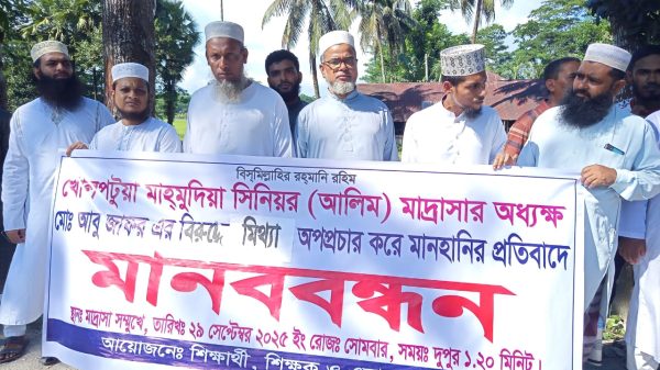 বরগুনা জেলা প্রতিনিধি মোঃ সোহরাব হোসেন: মিথ্যা অপপ্রচার ও মানহানির প্রতিবাদে শিক্ষার্থী, শিক্ষক ও এলাকাবাসীর উদ্যোগে মানববন্ধন অনুষ্ঠিত হয়েছে।বরগুনার বামনা উপজেলার যায়না ইউনিয়নের খোলপটুয়া মাহমুদিয়া সিনিয়র (আলিম) মাদ্রাসার অধ্যক্ষ মোঃ