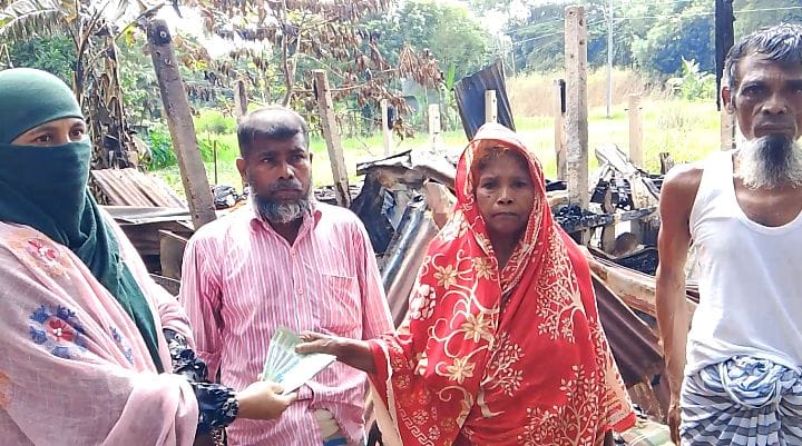 মোঃ তরিকুল ইসলাম রিপন মাদারীপুর প্রতিনিধিঃ মাদারীপুরে ডাসারে একজন হতদরিদ্র ও এক বিধবা পরিবারের দুটি বসতঘর আগুনে পুড়ে ছাই হয়ে গেছে। স্থানীয় সূত্রে জানা যায়,বৃহস্পতিবার (২ অক্টোবর) রাত (৮ ঘটিকার) সময় উপজেলার বালিগ্রাম ইউনিয়নের ধুধগ্রাম এলাকায় এই অগ্নিকাণ্ডের ঘটনা ঘটে। অগ্নিকান্ডে ক্ষতিগ্রস্থ বিধবা রানু বেগম ও আবু তালেব বেপারীর দুই টি বসতঘরে থাকা প্রায় দশ লাখ টাকার মালামালসহ আগুনে পুড়ে ছাই হয়ে যায়। পরে স্থানীয়রা ফায়ার সার্ভিস কে খবর দিলে ফায়ার সার্ভিসের কর্মীদের সহযোগিতায় আগুন নিভাতে সক্ষম হয়। অগ্নিকাণ্ড ক্ষতিগ্রস্ত পরিবারের বসতবাড়ি আগুনে পুড়ে যাওয়ার খবর পেয়ে পার্শ্ববর্তী এলাকার ইতালি প্রবাসী মেনাজুল আকন তার স্ত্রী নাজমা বেগমের মাধ্যমে দুইটি পরিবারকে নগদ দশ হাজার টাকা আর্থিক সহায়তা প্রদান করেন। ইতালি প্রবাসী মেনাজুল আকনের স্ত্রী নাজমা বেগম দৈনিক বাংলাদেশের আলো পত্রিকার মাদারীপুর প্রতিনিধি মোঃ হেমায়েত হোসেন খান কে বলেন, গতকাল বৃহস্পতিবার রাতে আমার স্বামী মেনাজুল আকন দুইটি ঘর আগুনে পুড়ে যাওয়ার খবর শুনে, ওই পরিবারকে নগদ অর্থ সহায়তার জন্য আমাকে পাঠিয়েছে। তাই আমি তাদের নগদ দশ হাজার টাকা দিয়ে সহযোগিতা করছি। এতে হতদরিদ্র বিধবা রানু বেগম কান্না জড়িত কন্ঠে বলেন, আমার স্বামী সন্তান কিছুই নাই,আমার ঘরের পাঁচ লাখ টাকার মালামাল আগুনে পুড়ে ছাই হয়ে গেছে। আপনারা সাংবাদিক আমি আপনাদের মাধ্যমে দেশের বিত্তবান মানুষ ও সরকারের কাছে সাহায্যের আবেদন করছি। এবিষয়ে অবসর প্রাপ্ত সেনা সদস্য মাসুদ খান বলেন,আমরা চল্লিশ জন অবসর প্রাপ্ত সেনা সদস্য রয়েছি, আমারা এই অসহায় পরিবারের পাশে দাঁড়াতে চেষ্টা করবো।