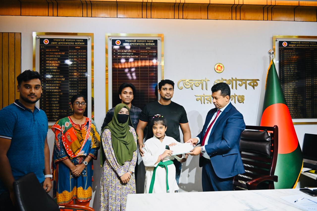 এস এম জহিরুল ইসলাম বিদ্যুৎঃ বাংলাদেশ মার্শাল আর্ট কনফেডারেশন আয়োজিত জাতীয় কম্বাত জুজুৎসু প্রতিযোগিতায় অংশগ্রহণে আর কোনো বাধা থাকলো না নারায়ণগঞ্জ জেলার খুদে খেলোয়াড়দের জন্য। দীর্ঘদিন ধরে আর্থিক সংকটে জর্জরিত বাংলাদেশ সেলফ ডিফেন্স অ্যান্ড স্পোর্টস কারাতে একাডেমির ক্ষুদে কারাতেদের অংশগ্রহণ প্রায় অনিশ্চিত হয়ে পড়েছিল। একাডেমির প্রতিষ্ঠাতা ও আন্তর্জাতিক কারাতে কোচ আশরাফুল ইসলাম জানান, “একটি ইভেন্টে অংশগ্রহণের জন্য রেজিস্ট্রেশনসহ নানা খরচ হয়। আমাদের একাডেমির অনেক শিক্ষার্থী আর্থিকভাবে সক্ষম নয়। কেউ কেউ মাসিক বেতনও দিতে পারে না।” তিনি আরও বলেন, “কোনো উপায় না দেখে আজ বৃহস্পতিবার আমরা কয়েকজন কোচ, ক্ষুদে কারাতে শিক্ষার্থী এবং তাদের অভিভাবকরা মিলে জেলা প্রশাসক জাহিদুল ইসলাম স্যারের কাছে যাই। সেখানে আমরা আর্থিক সহায়তার আবেদন জমা দিই। স্যার একটুও দেরি না করে সঙ্গে সঙ্গেই অনুদানের চেক হস্তান্তর করেন।” রাজধানীর সুলতানা কামাল মহিলা ক্রীড়া কমপ্লেক্সে আগামী শনিবার ( ১১ অক্টোবর) অনুষ্ঠিতব্য এই জাতীয় কারাতে প্রতিযোগিতায় নারায়ণগঞ্জ থেকে মোট ২৮ জন খেলোয়াড় অংশ নিচ্ছে বলে জেলা প্রশাসন সূত্রে জানা গেছে। জেলা প্রশাসকের সঙ্গে সাক্ষাৎকালে উপস্থিত ছিল গ্রীন হেরা একাডেমির নার্সারি শ্রেণির শিক্ষার্থী ও ক্ষুদে কারাতে খেলোয়াড় ফাইহা বিনতে ফরহাদ আবদিয়া এবং তার মা রিফাত সুলতানা।ডিসির সঙ্গে সাক্ষাৎ শেষে টেলিফোনে এই প্রতিবেদকের সাথে কথা বলার সময় আবদিয়া জানায়, “ডিসি আংকেল আমাকে অনেক আদর করেছেন। খেলাধুলার পাশাপাশি ভালোভাবে পড়াশোনা করার পরামর্শ দিয়েছেন।” তার মা রিফাত সুলতানা বলেন, “ডিসি স্যারের ব্যবহার অত্যন্ত ভালো। তিনি বাচ্চাদের খুব পছন্দ করেন এবং খেলাধুলার প্রতি তার অনেক আগ্রহ আছে। এর আগেও যখন নারায়ণগঞ্জ জেলার খুদে কারাতেরা জাতীয় ও আন্তর্জাতিক পর্যায়ে মেডেল জিতেছিল, তখন ডিসি অফিসের হলরুমে তাদের দাওয়াত দিয়ে সার্টিফিকেট ও মিষ্টি দিয়ে উৎসাহিত করেছিলেন।” তিনি আরও যোগ করেন, “তখন ডিসি স্যার বলেছিলেন—‘আমি যদি আগে জানতাম, তাহলে তোমাদের জন্য আরও কিছু করতাম। শুধু সার্টিফিকেট দিয়ে আমার মন ভরছে না।’” বাংলাদেশ সেলফ ডিফেন্স অ্যান্ড স্পোর্টস কারাতে একাডেমির নারী কোচ ও ব্ল্যাক বেল্টধারী রোকেয়া জাহান মীমও জেলা প্রশাসক জাহিদুল ইসলামের প্রশংসায় পঞ্চমুখ। তিনি বলেন, “আজ আমাদের অফিসে ডেকে আপ্যায়ন করেছেন, সবার সঙ্গে ছবি তুলেছেন। আগেও ভালো খেলায় অংশগ্রহণের জন্য আমাকে উৎসাহ দিয়েছেন। ডিসি স্যার বলেছেন, আমরা যখন পদক নিয়ে আসি, সেটা পুরো নারায়ণগঞ্জ জেলার সম্মান।”রোকেয়া জাহান মীম আরও জানান, “স্যার আমাদের আগামী প্রতিযো