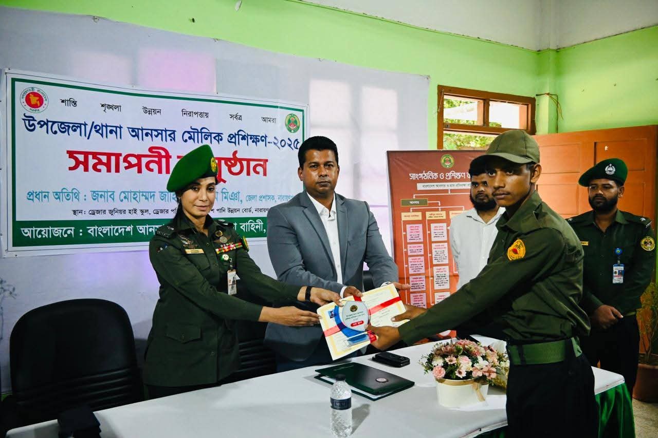এস এম জহিরুল ইসলাম বিদ্যুৎ : আজ ১৮ অক্টোবর শনিবার ২০২৫ তারিখে বাংলাদেশ আনসার ও গ্রাম প্রতিরক্ষা বাহিনী নারায়ণগঞ্জ এর উদ্যোগে ১৪ দিনব্যাপী উপজেলা/থানা আনসার মৌলিক প্রশিক্ষণ-৩য় ধাপের সমাপনী অনুষ্ঠান অনুষ্ঠিত হয়। নারায়ণগঞ্জ জেলার মোট ১২৭(একশত সাতাশ)জন আবাসিক/ অনাবাসিক প্রশিক্ষণার্থী স্বতঃস্ফূর্তভাবে এ প্রশিক্ষণে অংশগ্রহণ করেন। এই প্রশিক্ষণের মূল লক্ষ্য ও উদ্দেশ্য হলো তৃণমূল পর্যায়ে আনসার প্লাটুনকে সুসংগঠিত করা, দেশরক্ষা ও অভ্যন্তরীণ নিরাপত্তা চেতনাকে আরও সুদৃঢ় করা। অভিজ্ঞ প্রশিক্ষক মণ্ডলীর তত্ত্বাবধানে প্রশিক্ষণার্থীরা আসন্ন জাতীয় নির্বাচনসহ জাতীয় যেকোন প্রয়োজনে স্বেচ্ছাশ্রমে অংশগ্রহণের বাস্তবমুখী অনুশীলন সম্পন্ন করে। তরুণ প্রজন্মকে নীতি-নৈতিকতা, মূল্যবোধ ও দেশপ্রেমে সমৃদ্ধ করে সুশৃঙ্খল নাগরিক হিসেবে গড়ে তোলাই এ প্রশিক্ষণের অন্যতম উদ্দেশ্য। এছাড়া অতিথি বক্তাদের দিকনির্দেশনামূলক সেশন প্রশিক্ষণার্থীদের জ্ঞানকে আরও সমৃদ্ধ ও কার্যকর করে তুলেছে। সমাপনী অনুষ্ঠানে প্রশিক্ষণার্থীরা দেশপ্রেমে উজ্জীবিত হয়ে একযোগে দীপ্তকন্ঠে জাতীয় সেবায় আত্মনিয়োগের শপথ বাক্য পাঠ করে। সমাপনী অনুষ্ঠানে প্রধান অতিথি হিসেবে উপস্থিত ছিলেন জেলা প্রশাসক ও বিজ্ঞ জেলা ম্যাজিস্ট্রেট মোহাম্মদ জাহিদুল ইসলাম মিঞা , সভাপতি হিসেবে উপস্থিত ছিলেন , নারায়ণগঞ্জ জেলা কমান্ড্যান্ট, বাংলা আনসার ও গ্রাম প্রতিরক্ষা বাহিনী কানিজ ফারজানা শান্তা। এছাড়াও সমাপনী অনুষ্টানে প্রশিক্ষনার্থীদের মাঝে ক্রেষ্ট ও সনদপত্র বিতরণ করা হয়। জেলা প্রশাসক তাঁর বক্তব্যে প্রশিক্ষণার্থীদের প্রশিক্ষণ গ্রহণ করে দক্ষ মানবশক্তিতে পরিণত হয়ে দেশ ও দেশের মানুষের কল্যাণে কাজ করার আহবান জানিয়ে বলেন, আমরা যে আশরাফুল মাখলুকাত,অন্য সকল প্রাণি থেকে শ্রেষ্ঠ তার কারণ আমাদের বিবেক। আমাদের এই বিবেকবোধটুকু কাজে লাগিয়ে অন্যের দোষ না দেখে,অন্যের আশায় বসে না থেকে নিজের দায়িত্ব সঠিকভাবে পালন করে রাষ্ট্রকে এগিয়ে নিতে হবে। তিনি সকলকে মানবিক হয়ে কাজ করার কথাও জানান। উল্লেখ্য, নারায়ণগঞ্জ জেলায় পর্যায়ক্রমে মোট ৮টি ধাপে নির্ধারিত তারিখ ও সময় অনুযায়ী মোট ১৩৬০জন (এক হাজার তিনশত ষাট ) জন প্রশিক্ষণার্থীকে এই প্রশিক্ষণ প্রদান করা হবে।