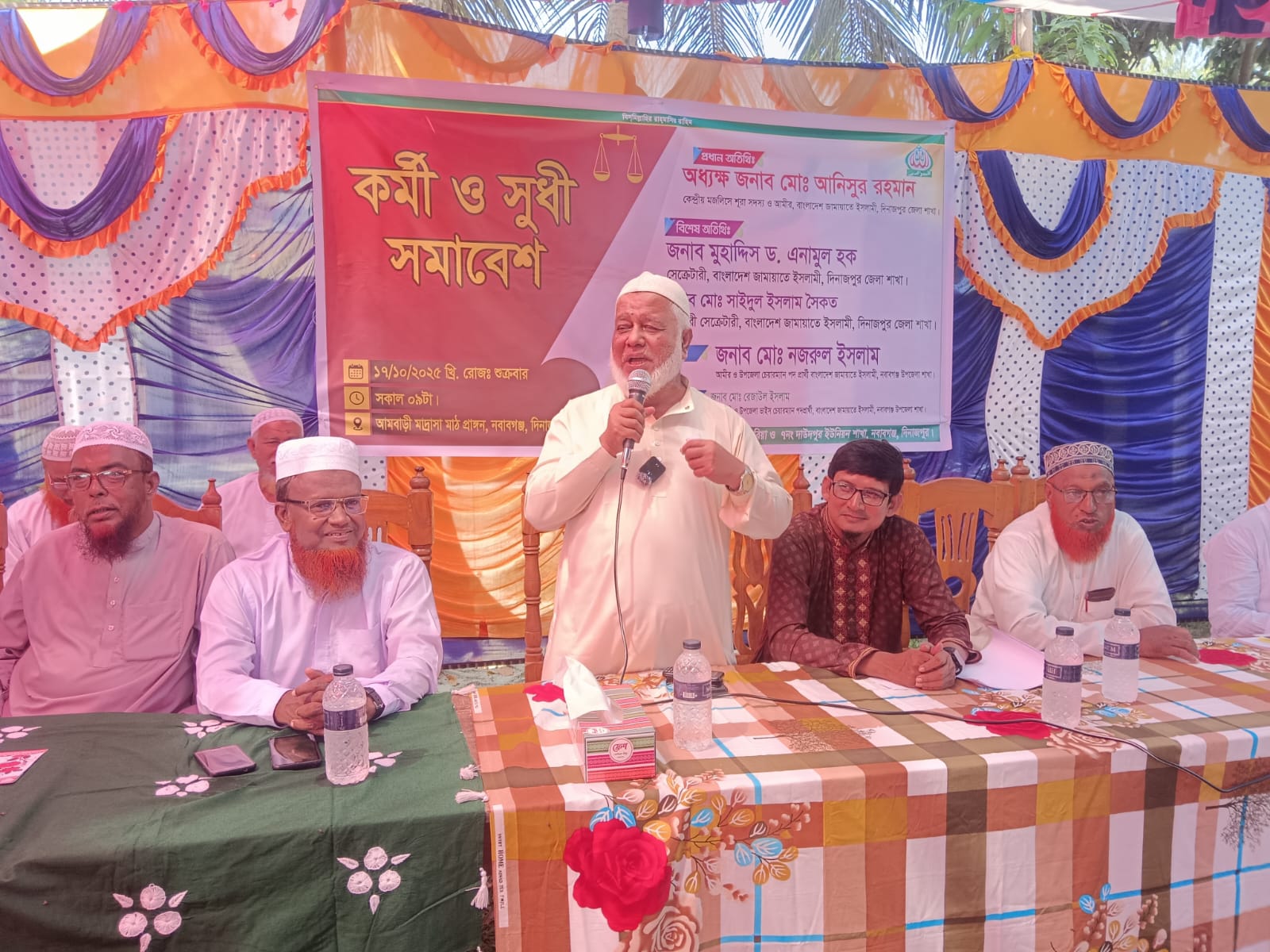 এম সাজেদুল ইসলাম সাগর, নবাবগঞ্জ( দিনাজপুর) প্রতিনিধিঃ দিনাজপুরের নবাবগঞ্জে বাংলাদেশ জামায়াতে ইসলামীর ৬নং ভাদুরিয়া ও ৭নং দাউদপুর ইউনিয়ন শাখার উদ্যোগে এক গুরুত্বপূর্ণ কর্মী ও সুধী সমাবেশ অনুষ্ঠিত হয়েছে। শুক্রবার ১৭ অক্টোবর সকাল ৯টায় হরিরামপুর বালিকা দাখিল মাদ্রাসায় এ সমাবেশ অনুষ্ঠিত হয়। সমাবেশে নবাবগঞ্জ উপজেলা সেক্রেটারি ও উপজেলা ভাইচ চেয়ারম্যান পদপ্রার্থী মোঃ রেজাউল ইসলামে সঞ্চালনায় সভাপতিত্ব করেন নবাবগঞ্জ উপজেলা আমির ও উপজেলা চেয়ারম্যান পদপ্রার্থী মোঃ নজরুল ইসলাম , প্রধান অতিথি হিসেবে উপস্থিত ছিলেন, বাংলাদেশ জামায়াতে ইসলামী কেন্দ্রীয় মজলিসে শূরা সদস্য ও দিনাজপুর জেলা শাখার আমীর অধ্যাপক মোঃ আনিসুর রহমান। কর্মী সভায় ৬নং ভাদুরিয়া ইউনিয়নের মাওলানা মোঃ আনতাজ আলী এবং ৭নং দাউদপুর ইউনিয়নের মাওলানা মোঃ লুৎফর রহমানকে চেয়ারম্যান প্রার্থী হিসেবে ঘোষণা করেন। এ সময় বিশেষ অতিথি হিসেবে উপস্থিত ছিলেন বাংলাদেশ জামায়াতে ইসলামী দিনাজপুর জেলা শাখার সেক্রেটারি মুহাদ্দিস ড. এনামুল হক। বাংলাদেশ জামায়াতে ইসলামী দিনাজপুর জেলা শাখার সহকারী সেক্রেটারি সাইদুল ইসলাম সৈকত সহ বাংলাদেশ জামায়াতে ইসলামী অবাইদুল ইসলাম উপজেলা সুরা সদস্য, আকমল হোসেন, উপজেলা সুরা সদস্য আঃ রহিম, রমজান আলী জেলা সহ সভাপতি, মুশফিকুর রহমান থানা শ্রমিক কল্যান সভাপতি রেজাউল ইসলাম থানা সেক্রেটারী প্রমূখ।