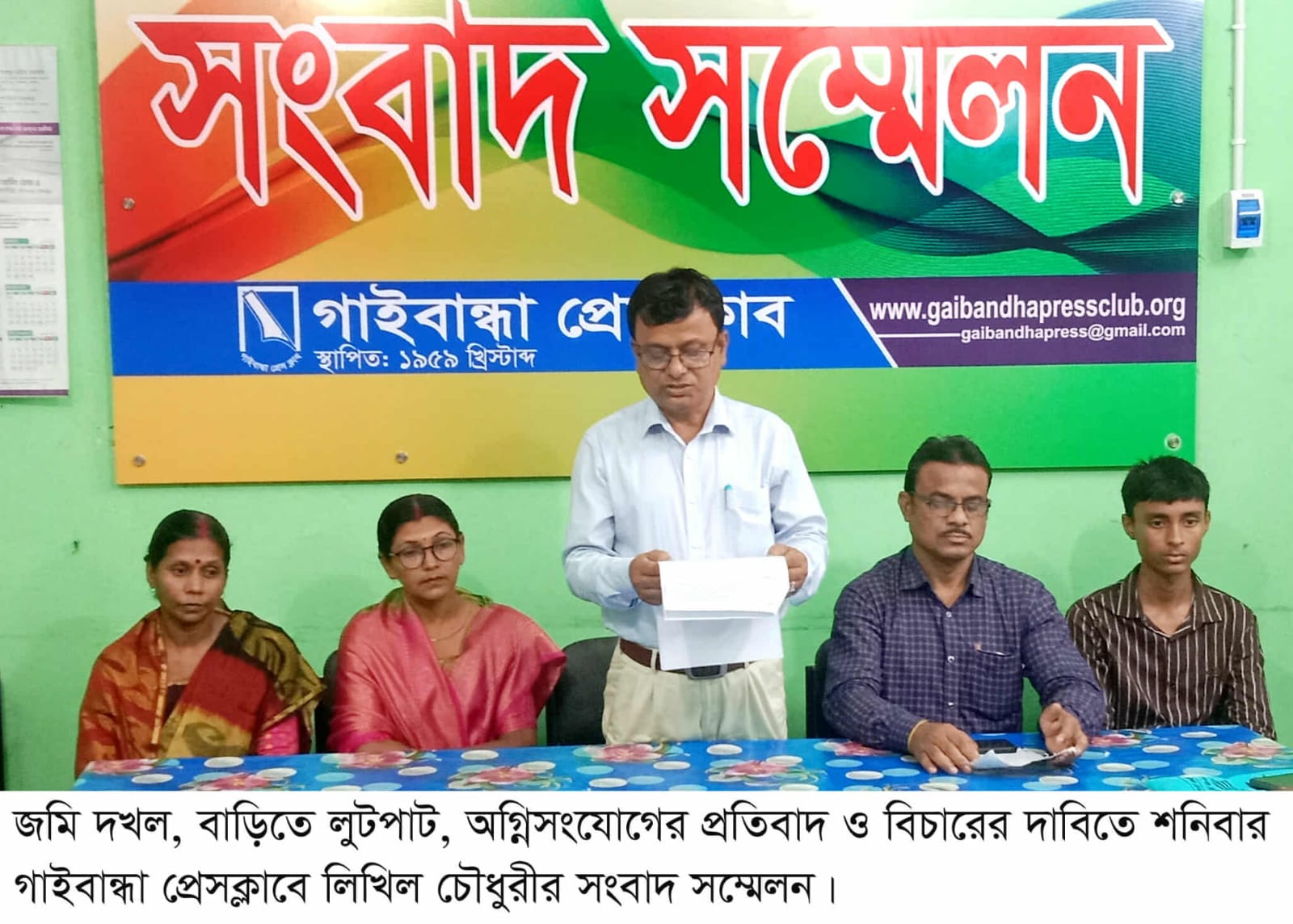 বাবুল রহমান রবিন গাইবান্ধা জেলা প্রতিনিধিঃ গাইবান্ধা জেলার সাদুল্ল্যাপুর উপজেলার কামারপাড়া ইউনিয়নের লক্ষীপুর গ্রামে সংখ্যালঘু হিন্দু সম্প্রদায়ের পরিবারের সম্পত্তি জোরপূর্বক দখল করার প্রতিবাদে সংবাদ সম্মেলনের আয়োজন করা হয়েছে। আজ শনিবার (১৮ অক্টোবর) দুপুরে গাইবান্ধা কাচারী বাজার প্রেস ক্লাবে এ সংবাদ সম্মেলনের আয়োজন করা হয়। আয়োজিত সংবাদ সম্মেলনে ভুক্তভোগী পরিবারের পক্ষে লিখিত বক্তব্য রাখেন, নিখিল কুমার চৌধুরী । সংবাদ সম্মেলনে তিনি অভিযোগ করেন, তাদের পৈত্রিক সুত্রে পাওয়া ৫ একর ৭২ শতক জমির মধ্যে ৪ একর ৪৬ শতক জমির ভুয়া দলিল তৈরি করে জোর পুর্বক দখল করেছে স্থানীয় মতিয়ার, মুকছুদার, মোকলেছ, মুসা সহ তাদের লোকজন। সেই সাথে জমিতে থাকা ১০০ টি কলাগাছ, ৬০-৭০ টি বাঁশ, ৫০-৬০ টি লেবু গাছ কেটে নিয়ে যায়। বাধা দিতে গেলেই তাদের বাড়ি ঘরে হামলা, অগ্নি সংযোগ, লুটপাট করা সহ হত্যার হুমকি দেওয়া হচ্ছে। সংবাদ সম্মেলনে আরো অভিযোগ করেন, বিষয়টি সাদুল্যাপুর থানা, উপজেলা নির্বাহী অফিসার সহ প্রশাসনের বিভিন্ন স্তরে অভিযোগ দায়ের করলে কোন প্রতিকার পান নি। সংবাদ সম্মেলনে ভুক্তভোগীরা অতিদ্রুত প্রতিপক্ষের জবরদখল করা জমিগুলো ফেরত পাওয়া সহ প্রশাসনের কাছে তাদের নিরাপত্তার জোর দাবি জানান। সংবাদ সম্মেলনে উপস্থিত ছিলেন, ভুক্তভোগী নিখিল কুমার চৌধুরী স্ত্রী তমা রানী, অর্পন চৌধুরী, ভাই উৎপল কুমার চৌধুরী, স্ত্রী শ্যামলী রানী সহ প্রিন্ট ও ইলেকট্রনিক মিডিয়ার সংবাদকর্মীরা।