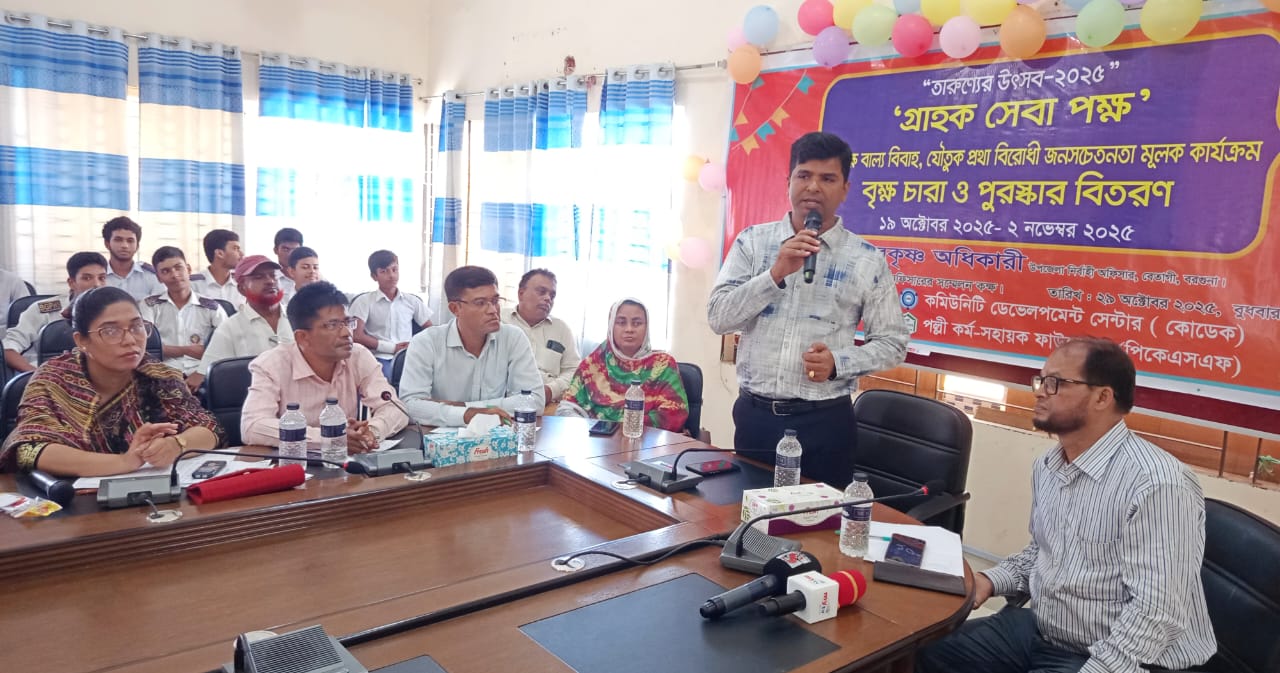 বরগুনা প্রতিনিধি: বরগুনার বেতাগীতে "তারুণ্যের উৎসব–২০২৫" উপলক্ষে 'গ্রাহক সেবা পক্ষ' পালন করা হয়েছে। এ উপলক্ষে বাল্যবিবাহ, যৌতুক ও মাদকবিরোধী জনসচেতনতামূলক কর্মসূচির অংশ হিসেবে বৃক্ষরোপণ ও পুরস্কার বিতরণ অনুষ্ঠান অনুষ্ঠিত হয়।বুধবার (২৯ অক্টোবর ২০২৫) বেতাগী উপজেলা নিরীক্ষা অফিস প্রাঙ্গণে এই অনুষ্ঠানটি অনুষ্ঠিত হয়। প্রধান অতিথি হিসেবে উপস্থিত ছিলেন বেতাগী উপজেলা নির্বাহী কর্মকর্তা হরেকৃষ্ণ অধিকারী। অনুষ্ঠানে প্রধান অতিথি বলেন, বাল্যবিবাহ, যৌতুক ও মাদক সমাজের জন্য অভিশাপ। তরুণ প্রজন্মকে সচেতন করে তোলাই এ ধরনের সামাজিক ব্যাধি প্রতিরোধের মূল উপায়। অনুষ্ঠান শেষে অংশগ্রহণকারীদের মাঝে বিভিন্ন প্রজাতির গাছের চারা ও পুরস্কার বিতরণ করা হয়। উদ্যোগটি বাস্তবায়ন করেছে কমিউনিটি ডেভেলপমেন্ট সেন্টার (কোডেক) এবং সার্বিক সহযোগিতায় ছিল পল্লী কর্ম-সহায়ক ফাউন্ডেশন (পিকেএসএফ)।