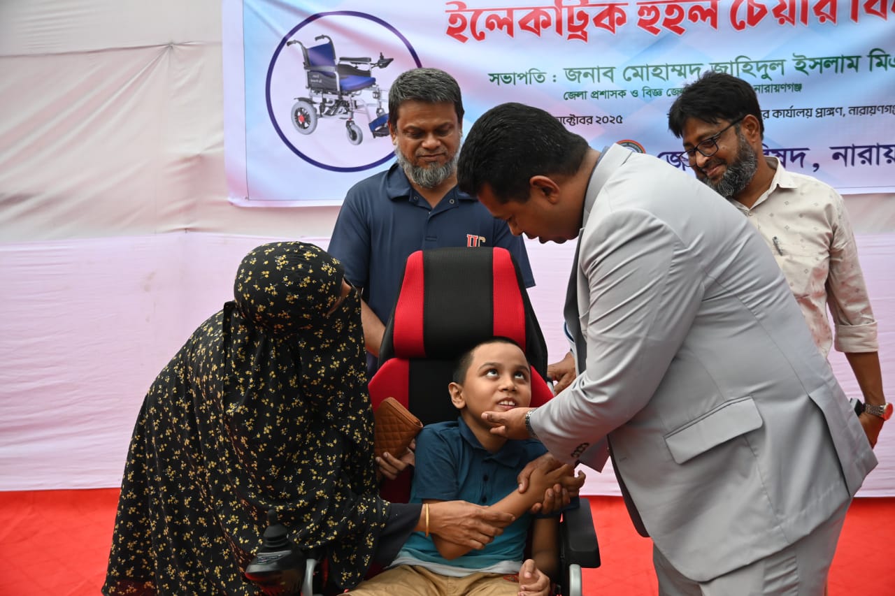 এস এম জহিরুল ইসলাম বিদ্যুৎ : নারায়ণগঞ্জে বিশেষ চাহিদাসম্পন্ন শিশুকে ইলেকট্রিক হুইলচেয়ার দেয়া হয়েছে। বুধবার (২৯ অক্টোবর ) বিকেলে জেলা প্রশাসক কার্যালয় চত্বরে এ হুইল চেয়ার দেয়া হয়। নারায়ণগঞ্জ জেলা পরিষদের আয়োজনে এ সময় উপস্থিত ছিলেন অতিরিক্ত জেলা প্রশাসক (সার্বিক) মোহাম্মদ আলমগীর হোসাইন, নারায়ণগঞ্জ সমাজসেবা অধিদপ্তরের উপ-পরিচালক মোঃ আসাদুজ্জামান সরদার। বিশেষ চাহিদা সম্পন্ন শিশুর অভিভাবক উপস্থিত ছিলেন। জেলা প্রশাসক মোহাম্মদ জাহিদুল ইসলাম মিঞা বলেন, বিশেষ চাহিদা সম্পন্ন শিশুদের প্রতি যত্নবান হতে হলে তাদের প্রয়োজন অনুযায়ী সঠিক যত্ন ও সহায়তা দিতে হবে, তাদের আত্মবিশ্বাস বাড়াতে হবে এবং তাদের স্বাধীনভাবে চলাফেরা করার সুযোগ দিতে হবে। তাদের প্রতি ইতিবাচক মনোভাব রাখা, পরিবারের সদস্যদের সহায়তা নেওয়া এবং তাদের জন্য একটি সুসম্পর্ক তৈরি করা জরুরি। তাদের প্রতি সহানুভূতিশীল হতে হবে এবং সমাজের অন্যান্য শিশুদের মতো তাদেরও সমাজে অন্তর্ভুক্ত করতে হবে। বিশেষ চাহিদা সম্পন্ন শিশুর মা বলেন, ‘আমি অসহায়। আমার সন্তানকে কোলে করে স্কুলে নিয়ে যায়। অভাবের সংসারে হুইলচেয়ার কেনা অসম্ভব ছিল। হুইল চেয়ার পাওয়ায় আমার সন্তান স্বাচ্ছন্দ্যে স্কুলে যেতে পারবে। জেলা সমাজসেবা অধিদপ্তরের উপ-পরিচালক মোঃ আসাদুজ্জামান সরদার বলেন, মানবিক জেলা প্রশাসক মোহাম্মদ জাহিদুল ইসলাম মিঞা বিশেষ চাহিদা সম্পন্ন শিশুর জন্য ইলেকট্রিক হুইল চেয়ার উপহার দিচ্ছেন। এ ধরনের কর্মসূচি অব্যাহত রাখার অনুরোধ করছি।