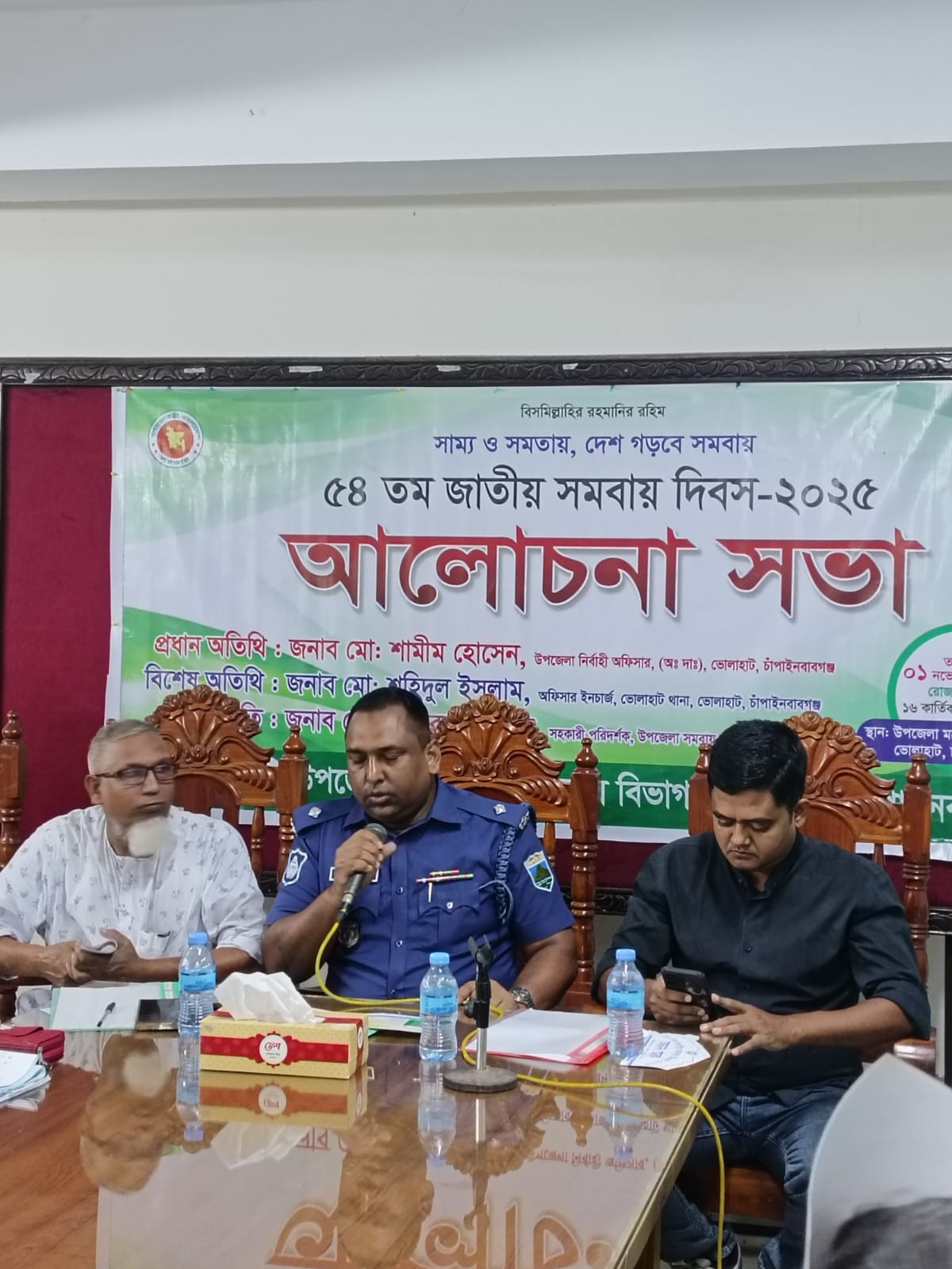 এম. এস.আই শরীফ, ভোলাহাট (চাঁপাইনবাবগঞ্জ) প্রতিনিধিঃ চাঁপাইনবাবগঞ্জের ভোলাহাটে ৫৪তম জাতীয় সমবায় দিবস ২০২৫ যথাযথভাবে শনিবার সকাল সাড়ে ১০টায় (১ নভেম্বর ২০২৫) উপলক্ষ্যে দিনটি পালনে জাতীয় ও সমবায় উত্তোলন, বর্ণাঢ্য র্যালী, আলোচনা সভা অনুষ্ঠিত হয়। এলক্ষ্যে উপজেলা প্রশাসন ও উপজেলা সমবায় অফিস কর্তৃক আয়োজিত অনুষ্ঠানের প্রথমেই একটি র্যালী উপজেলার প্রধান সড়ক প্রদক্ষিণ শেষে উপজেলা মডেল মসজিদ মিলনায়তনে আলোচনা সভায় মিলিত হয়। পবিত্র কুরআন তেলাওয়াতের মধ্যদিয়ে অনুষ্ঠানের কর্মসূচী শুরু হয়। তেলাওয়াত করেন, মোঃ মুরশালীন ইসলাম। উপজেলা সমবায় সহকারী পরিদর্শক মোহাঃ আবদুল জলিলের সভাপতিত্বে বিশেষ অতিথি হিসেবে উপস্থিত ছিলেন, উপজোলা কৃষি অফিসার কৃষিবিদ মোঃ সুলতান আলী, থানা অফিসার ইনচার্জ মোঃ শহিদুল ইসলাম, উপজেলা সমাজসেবা অফিসার মোঃ নাসিম উদ্দিন ও গ্রাম আদালত প্রকল্প সমন্বয়ক সন্ধ্যা রানী। "সাম্য ও সমতায়, দেশ গড়বে সমবায়" এ প্রতিপাদ্যকে কেন্দ্র করে অনুষ্ঠান সঞ্চালনায় ছিলেন, সহকারী শিক্ষক মোঃ কাইফুল ইসলাম। সমবায়ীদের মধ্যে বক্তব্য রাখেন, সহকারী পরিদর্শক জামিল উদ্দিন, অফিস সহায়ক আশিকুর রহমান, প্রগতি আর্থ সামাজিক উন্নয়ন সমবায় সমিতির সভাপতি মোঃ নুরুল ইসলামসহ সুধীজনেরা।