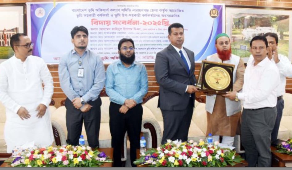 এস এম জহিরুল ইসলাম বিদ্যুৎ : বাংলাদেশ ভূমি অফিসার্স কল্যাণ সমিতি নারায়ণগঞ্জ জেলা শাখার উদ্যোগে অবসরপ্রাপ্ত ভূমি সহকারী কর্মকর্তা ও ভূমি উপসহকারী কর্মকর্তাদের বিদায় সংবর্ধনা অনুষ্ঠান অনুষ্ঠিত হয়েছে। শনিবার (১ নভেম্বর) সকালে নারায়ণগঞ্জ সার্কিট হাউসে অনুষ্ঠিত এ অনুষ্ঠানে প্রধান অতিথি ছিলেন জেলা প্রশাসক মো. জাহিদুল ইসলাম মিঞা। বিশেষ অতিথি হিসেবে উপস্থিত ছিলেন অতিরিক্ত জেলা প্রশাসক (রাজস্ব) মো. সাখাওয়াত হোসেন, বাংলাদেশ ভূমি অফিসার্স কল্যাণ সমিতির কেন্দ্রীয় সভাপতি মোতাহার হোসেন খান এবং কেন্দ্রীয় মহাসচিব মো. আসাদুজ্জামান। অনুষ্ঠানটি সঞ্চালনা করেন জেলা সাধারণ সম্পাদক কামরুল হাসান। জেলা প্রশাসক জাহিদুল ইসলাম মিঞা বলেন, “আপনারা যারা ইউনিয়ন পর্যায়ে সরকারের রাজস্ব সংগ্রহে নিরলসভাবে কাজ করেছেন, আপনারাই প্রশাসনের মূল চালিকাশক্তি। দেশের সেবায় আপনারা যে সময় ও শ্রম দিয়েছেন, তা জাতি কৃতজ্ঞতার সঙ্গে স্মরণ রাখবে। ভবিষ্যতে আপনারা পরিবারের সঙ্গে সময় কাটাবেন, সন্তানদের প্রতি মনোযোগী হবেন এবং দেশের কল্যাণে সমাজে অবদান রাখবেন- এটাই প্রত্যাশা।” অনুষ্ঠানের শুরুতে পবিত্র কোরআন তেলাওয়াত ও গীতা পাঠের মাধ্যমে কর্মসূচি শুরু হয়। পরে জাতীয় সংগীত পরিবেশন করা হয়।অনুষ্ঠানে অবসরপ্রাপ্ত কর্মকর্তাদের সম্মাননা ক্রেস্ট ও উপহার সামগ্রী প্রদান করা হয়। এ সময় আরও উপস্থিত ছিলেন সমাজসেবক মোহাম্মদ শাহজাহান, সেন্টু আহমেদ, ও আশরাফ উদ্দিন ভূঁইয়া প্রমুখ।