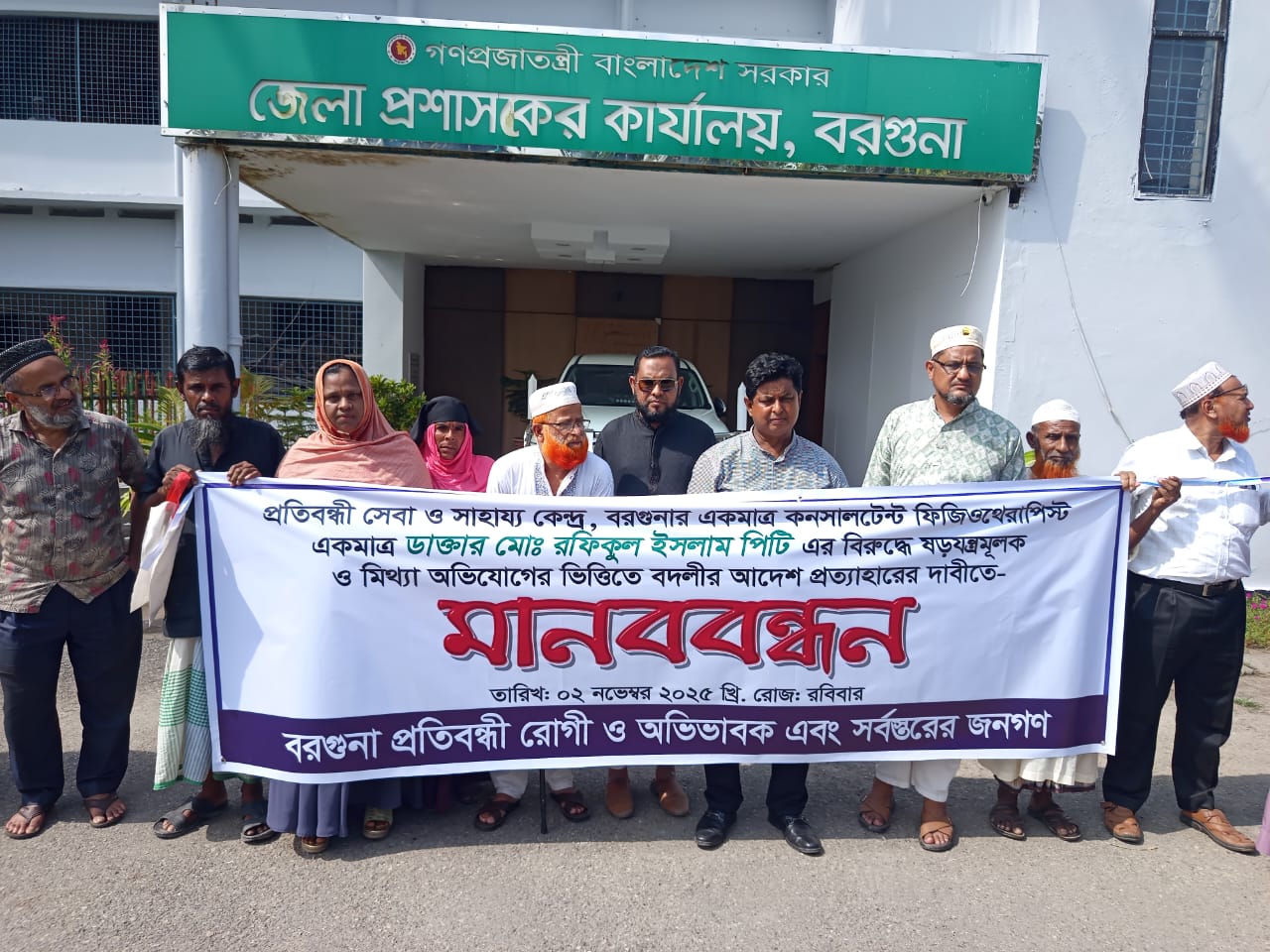 বরগুনা প্রতিনিধি: বরগুনায় প্রতিবন্ধী সেবা ও সাহায্য কেন্দ্রের কনসালটেন্ট ফিজিওথেরাপিস্ট ডা. মো. রফিকুল ইসলামের বিরুদ্ধে ষড়যন্ত্রমূলক মিথ্যা অভিযোগের প্রতিবাদে এবং তার বদলি আদেশ বাতিলের দাবিতে মানববন্ধন ও স্মারকলিপি প্রদান করা হয়েছে। রবিবার (২ নভেম্বর ২০২৫) সকালে বরগুনা জেলা প্রশাসক কার্যালয় সামনে ঘন্টা ব্যাপী এ মানববন্ধন অনুষ্ঠিত হয়। পরে জেলা প্রশাসকের নিকট স্মারকলিপি প্রদান করেন প্রতিবন্ধী সেবা ও সাহায্য কেন্দ্রের সেবা গ্রহীতা ও এলাকাবাসী। এ সময় উপস্থিত ছিলেন জেলা বিএনপির সাবেক সাংগঠনিক সম্পাদক রেজবুল কবির। মানববন্ধনে বক্তারা বলেন, ডা. রফিকুল ইসলাম দীর্ঘদিন ধরে অত্যন্ত আন্তরিকতা ও দক্ষতার সঙ্গে প্রতিবন্ধী ও অসুস্থ রোগীদের ফিজিওথেরাপি সেবা দিয়ে আসছেন। তার চিকিৎসা গ্রহণ করে বহু রোগী সুস্থতা ফিরে পেয়েছেন। তিনি রোগীদের প্রতি সদাচরণ, সময়মতো সেবা প্রদান এবং হাতে-কলমে ব্যায়াম শেখানোর মাধ্যমে মানুষের আস্থা অর্জন করেছেন। তারা আরও অভিযোগ করেন, সম্প্রতি প্রশাসনিক কর্মকর্তা সঞ্জয় মিস্ত্রীর বিরুদ্ধে অসাদাচরণের অভিযোগে কর্তৃপক্ষ তাকে বদলি করলেও, পরবর্তীতে ওই কর্মকর্তা প্রতিশোধমূলকভাবে ডা. রফিকুল ইসলামের বিরুদ্ধে মিথ্যা ও বানোয়াট অভিযোগ সংগঠিত করেছেন। বক্তারা বলেন, এই ষড়যন্ত্রমূলক অভিযোগের মাধ্যমে একজন নিবেদিতপ্রাণ চিকিৎসককে হেয় প্রতিপন্ন করার চেষ্টা চলছে। তাই এই মিথ্যা অভিযোগ প্রত্যাহার ও ডা. রফিকুল ইসলামের বদলি আদেশ বাতিলের দাবিতে মানববন্ধনে অংশগ্রহণকারীরা একযোগে আওয়াজ তোলেন। মানববন্ধনে রোগী, তাদের স্বজন ও এলাকাবাসীসহ বিভিন্ন শ্রেণিপেশার মানুষ অংশ নেন। তারা ডা. রফিকুল ইসলামের দ্রুত পুনর্বহাল এবং দোষীদের বিরুদ্ধে প্রশাসনিক ব্যবস্থা নেওয়ার দাবি জানান।