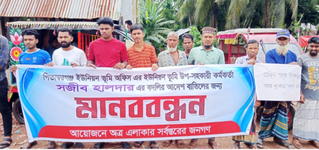 বরগুনা প্রতিনিধি: বরগুনা সদর উপজেলার নলটোনা ইউনিয়নের পিতাম্বরগঞ্জ ইউনিয়নে অনুষ্ঠিত হয়েছে মানববন্ধন। ইউনিয়ন ভূমি অফিসের উপ-সহকারী কর্মকর্তা সজীব হালদার এর বদলি আদেশ বাতিলের দাবিতে এই মানববন্ধনের আয়োজন করে এলাকাবাসী। মঙ্গলবার সকালে পিতাম্বরগঞ্জ বাজার চত্বরে সর্বস্তরের জনগণের উদ্যোগে এ কর্মসূচি অনুষ্ঠিত হয়। এ সময় বক্তারা বলেন, দায়িত্ব পালনের সময় সজীব হালদার ভূমি সেবা সহজীকরণে নিরলসভাবে কাজ করেছেন এবং একটি দুর্নীতিমুক্ত ও জনবান্ধব পরিবেশ গড়ে তুলতে গুরুত্বপূর্ণ ভূমিকা রেখেছেন। বক্তারা আরও বলেন, তার বদলির আদেশে এলাকাবাসী ক্ষুব্ধ ও হতাশ। তারা প্রশাসনের প্রতি বদলির আদেশ দ্রুত প্রত্যাহারের দাবি জানান।